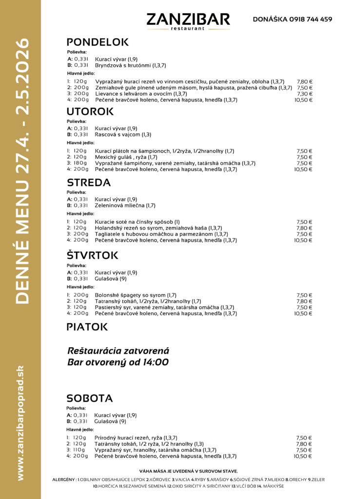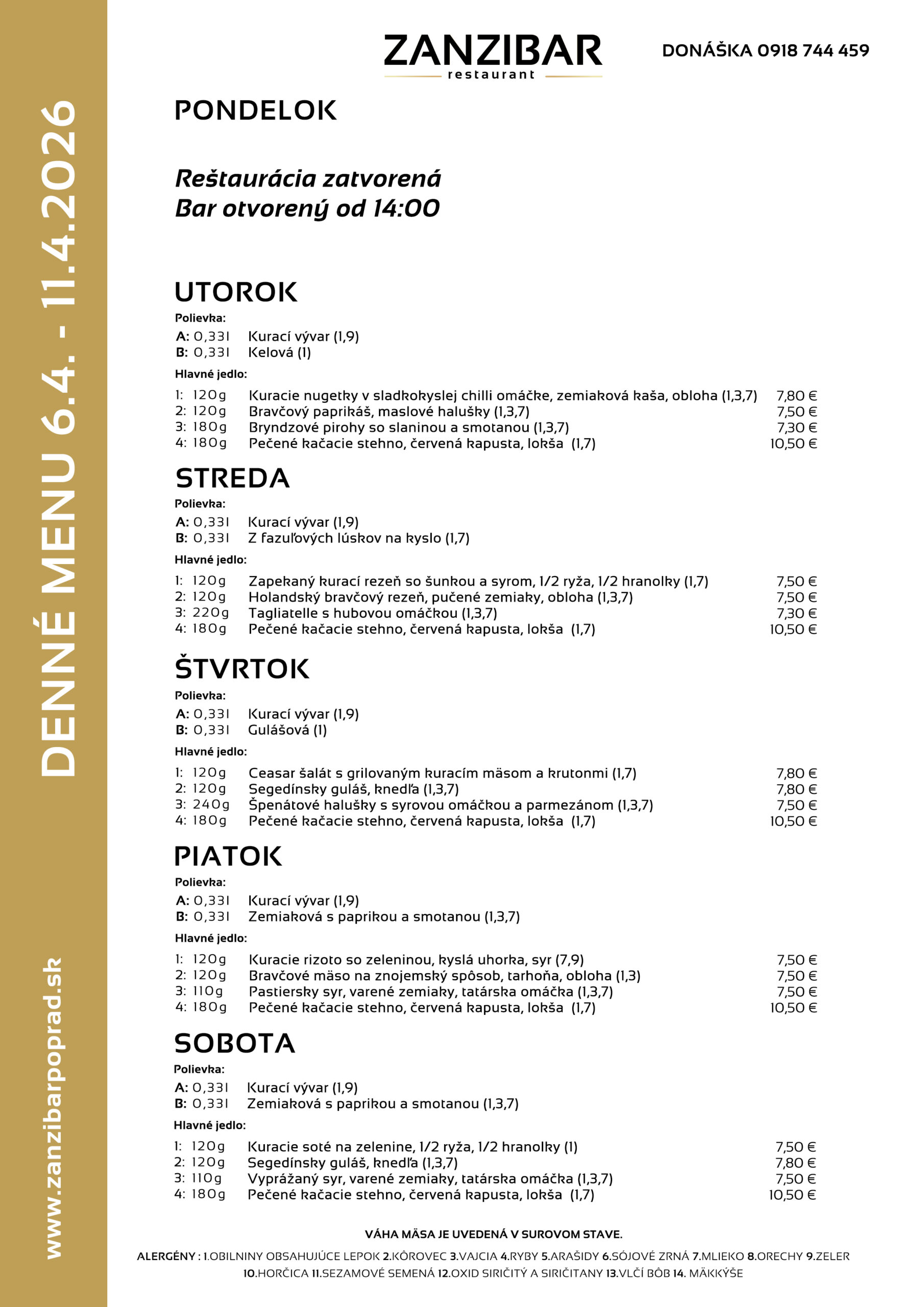 ZanziBar & Restaurant denné menu 6.4. – 11.4.2026
